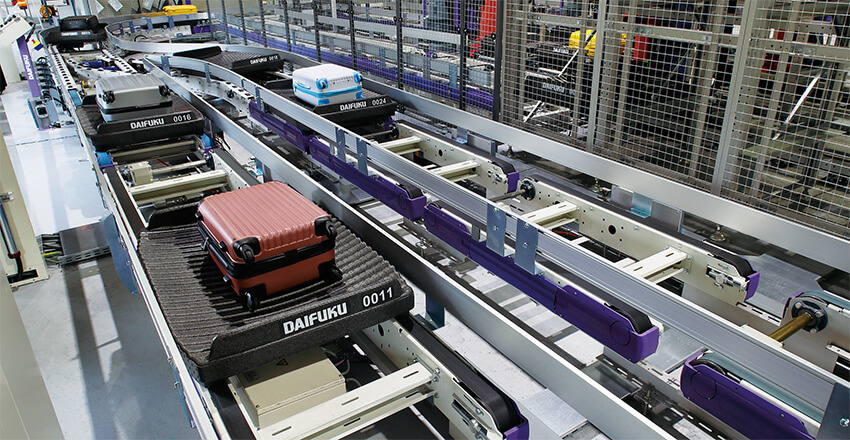 The baggage handling system efficiently transports and sorts passengers’ checked baggage at high speeds. It is designed for environments requiring rapid sorting of large volumes of baggage, such as in major airports. Unlike conventional belt conveyor systems, this system prevents damage to items by transporting each item individually on its own tray. By replacing the traditional wide belt with a combination of a narrow belts and rollers, we have successfully reduced the size of the motor. Additionally, by implementing an energy-efficient control system that activates the conveyor only when baggage trays pass through, we have significantly reduced energy consumption. The system reads the RFID chips attached to each tray, allowing for precise tracking of baggage in transit. This not only helps prevent lost baggage, but also reduces the labor and manpower needed to resolve baggage congestion.