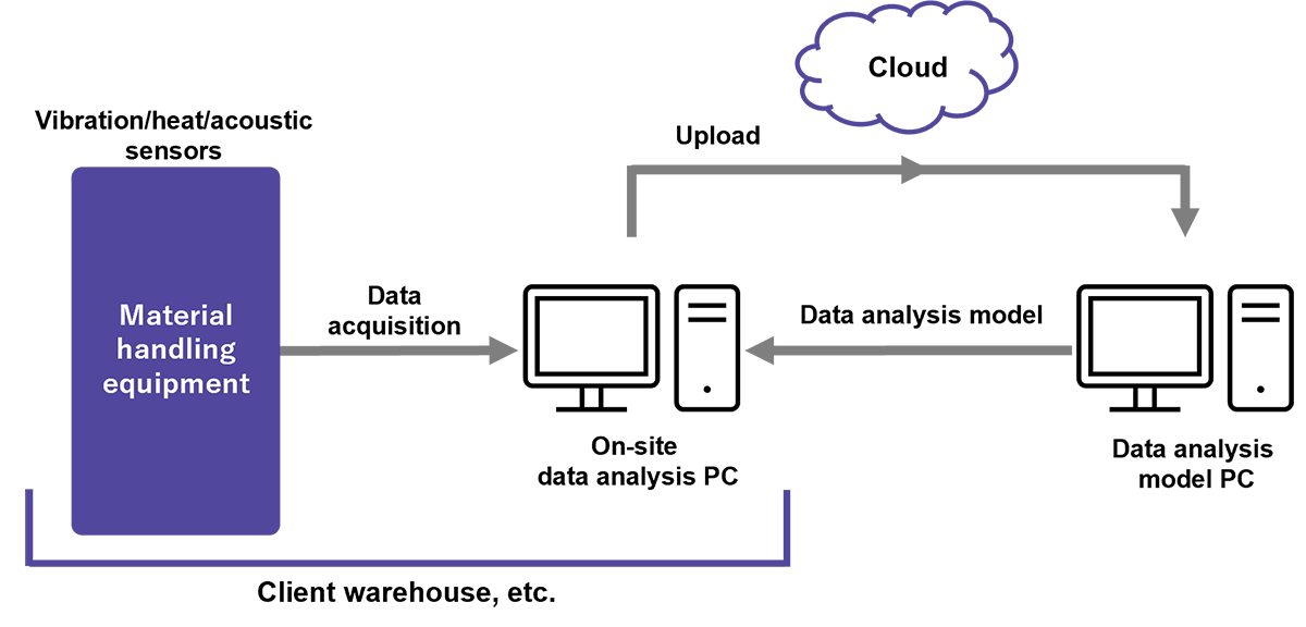 In our intralogistics business, the Group has established a unique predictive maintenance system that automates visual, manual, and auditory inspections. The predictive maintenance system measures vibration, heat generation, and acoustics using our proprietary sensors, analyzes the data collected by edge devices onsite using a PC, and notifies the customer of equipment abnormalities and predicted failure points. The system also automatically uploads data to the cloud, analyzes failure data, and builds an equipment diagnostic abnormality detection model using AI. This system eliminates conveyor system breakdowns and keeps equipment running smoothly.