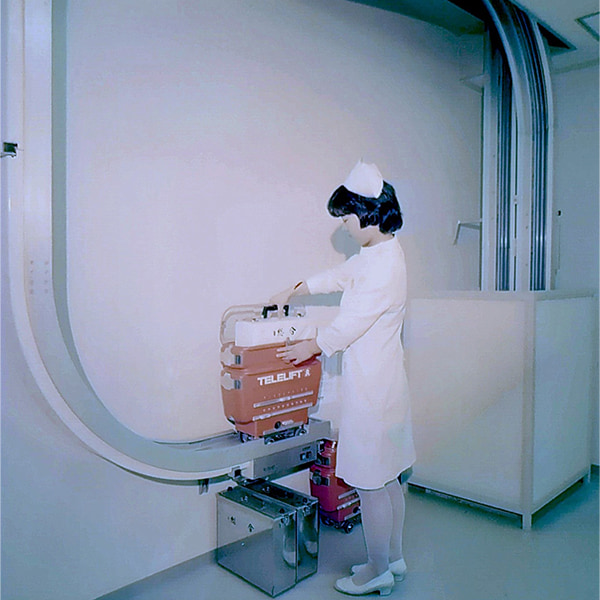 The Telelift is a system originally developed by the German company Telelift GmbH in the 1960s. Following the spread of the system, Daifuku formed a technical alliance with a company in Switzerland to bring the system to Japan. Based off the technology exchange, Daifuku produced its own Telelift and would deliver its first Telelift system to Omiya Red Cross Hospital (name at the time) in 1975. At the time, the shortage of nurses was a growing social issue, and in addition to low numbers, nurses were having to spend over a tenth of their time just transporting things from one place to another. This led to the idea of streamlining material handling within hospitals. The deployment of Daifuku’s Telelift automated the transportation of small items such as medical records, X-ray films, slips, specimens, and medications, allowing nurses to use the time that they had previously spent transporting such items on improving medical service instead.