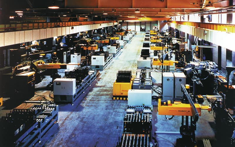 Taking advantage of this trend, Daifuku helped FANUC complete its new factory—considered at the time to be one of the world’s most advanced automation-based factories—in 1982 in the foothills of Mt. Fuji. This two-story factory for mass production of machine tool motors covered 13,800 square meters and included machining on the first floor and assembly on the second.