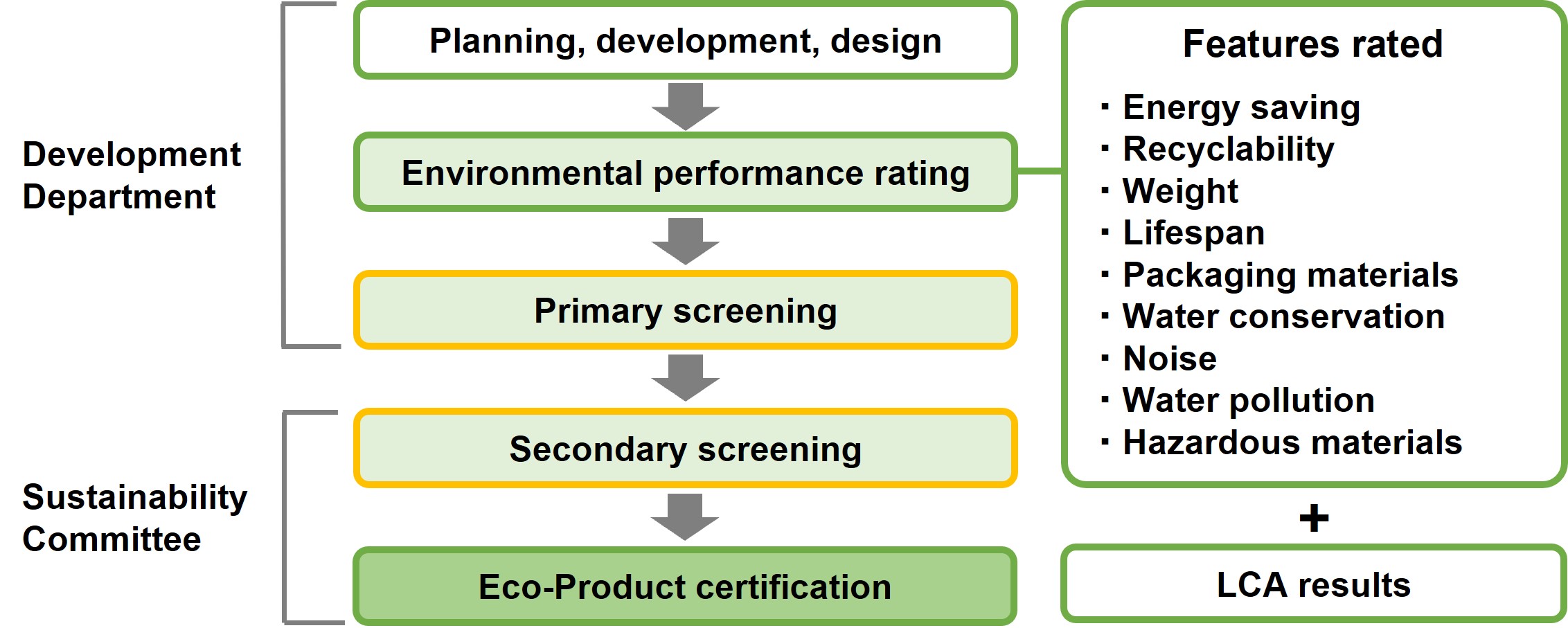 In 2012, Daifuku began its Daifuku Eco-Products Certification Program, which certifies products based on an environmental impact assessment rating and a certification system using the Group's own standards. Under the program, all products across the Group are measured under the same standards, with measurements coming from the results of a Life Cycle Assessment (LCA) and performance assessments on a number of areas, including energy saving, recyclability, weight, lifespan, packaging materials, water conservation, noise, water pollution, and hazardous materials. As of May 2023, 83 products have met the standards and been certified as Daifuku Eco-Products.