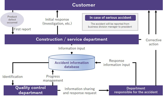 Should a major accident occur with our product, we carry out cross-company measures that incorporate other departments according to the need for detailed accident information by other operational departments and to register the corrective measures taken in a database. Reporting procedures are set out in the ISO Corrective Action and Preventive Measures Procedural Guide. We are thorough in preventing the recurrence of accidents and carrying out preventive measures, and we regularly implement management reviews through the CEO to verify the suitability of the quality management system.