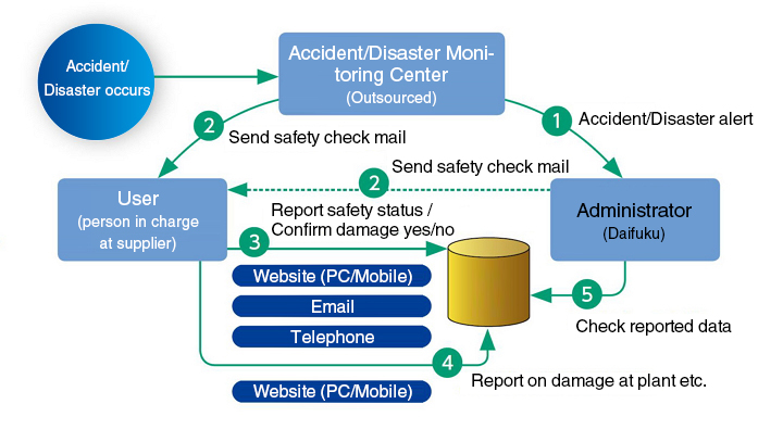To ensure stable procurement of parts and other supplies in the event of a disaster, we have introduced a Supplier Operation Verification System that enables rapid collection of information on damage to suppliers. In an emergency, this system confirms the status of damage to suppliers and safety of personnel by e-mail, which allows for timely restoration and return to normal business operations for the entire supply chain. Periodic training is conducted with suppliers to bolster operational proficiency, and in the event of an emergency, the system is used to confirm the viability of operations and the delivery date of parts.