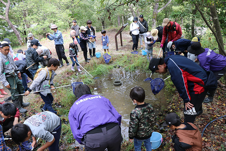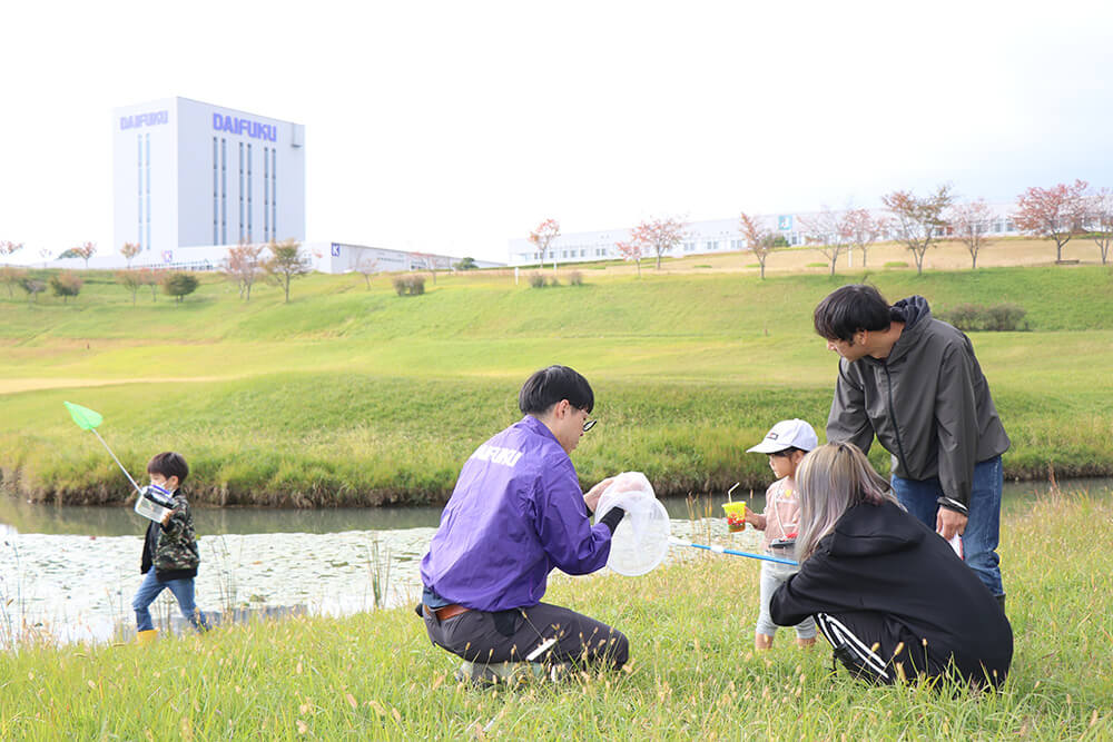 Every fall, Daifuku holds a nature observation event for employees and their families. In addition to surveying insects and other creatures that call Shiga Works home, the Yamato salamander conservation pond is temporarily drained, and event participants work together to collect and relocate any organisms that prey on the rare salamander.