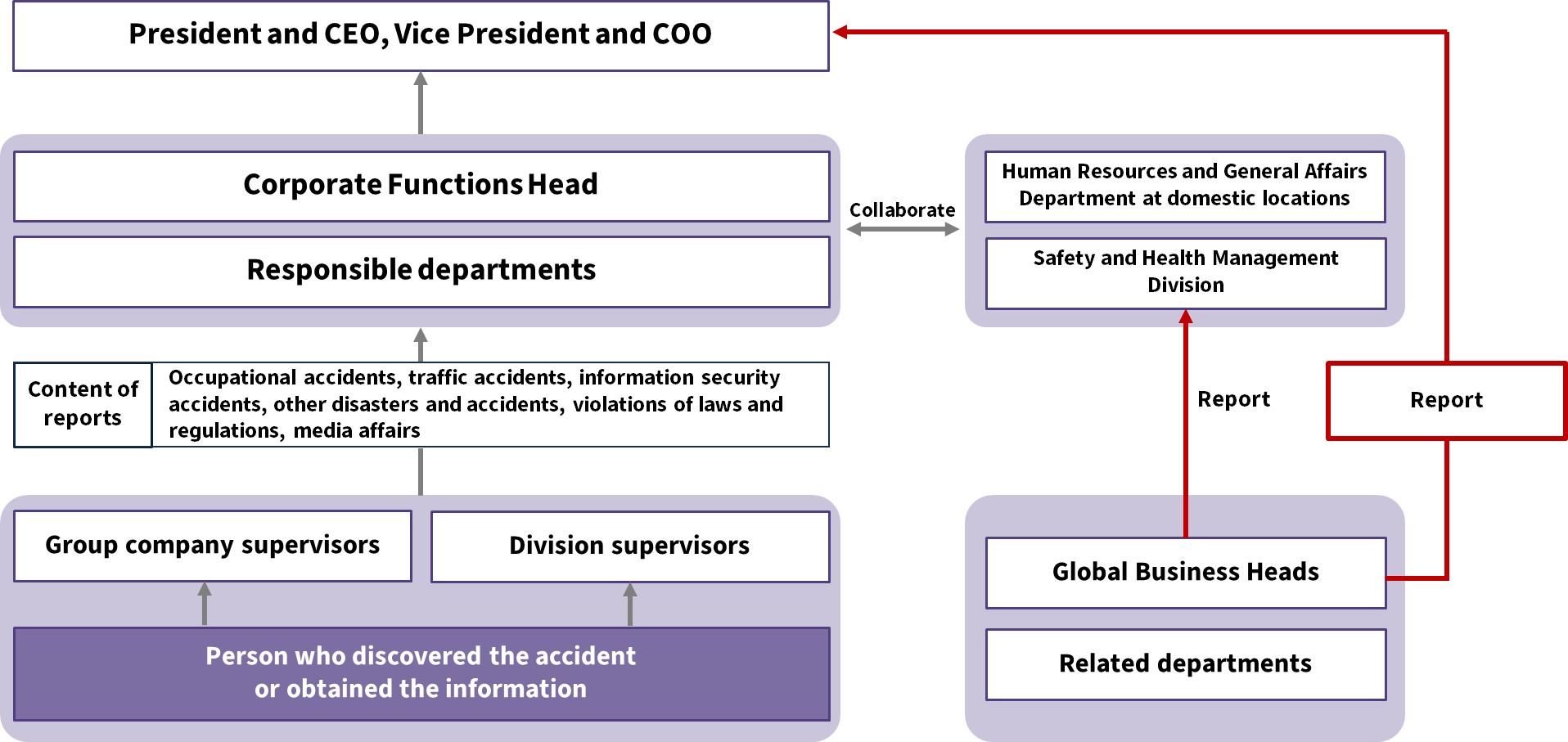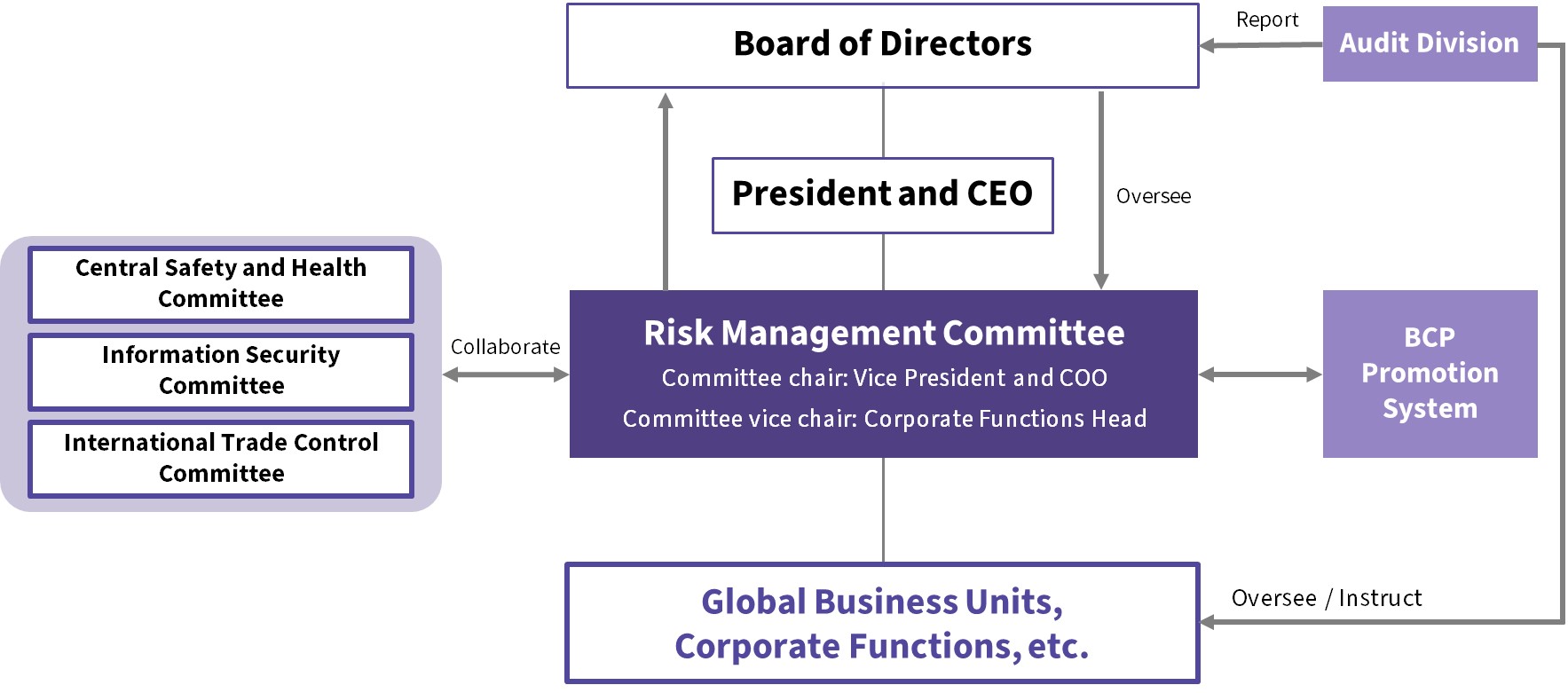 In order to strengthen the risk management system, the Central Safety and Health Committee, the Information Security Committee, and the International Trade Control Committee work in cooperation with the Risk Management Committee, effective starting fiscal 2023. The main roles of each committee are as follows.