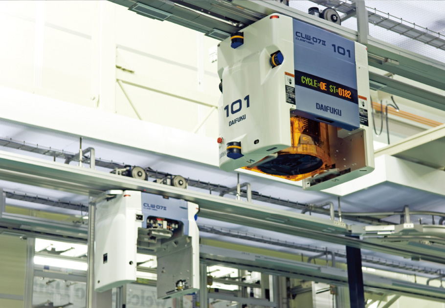 最先端の半導体製造工場では、800~1,200もの製造工程に対しウエハを入れた容器を、20km にも及ぶレールに沿って、20,000搬送/時間のペースで、24時間365日一つの間違いもなく搬送・保管することが要求されます。世界有数のメーカーからの、こうした極めて高度な技術や、個々の要求に対応できることがダイフクの大きな強み。さらに、納入後のトラブルも少なく、高い信頼性を得ています。また、ソフトウェアの活用による効率的な搬送・保管、大規模な工場間のシームレスな搬送・保管などに応えうる拡張性においても優位性を発揮しています。